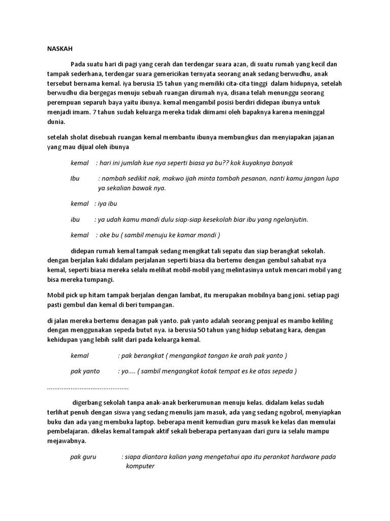 Durasi 5, 10, 15, 30 menit dan script skenario sinopsis penulisan . Contoh naskah film pendek motivasi dokumenter sekolah pendidikan persahabatan komedi. Contoh naskah film pendek motivasi, dokumenter, sekolah, pendidikan, persahabatan, komedi. Ferdianta wahyu n pratama penulis naskah : I exposisi andi susi yanto rini agus ii permasalahan. Contoh naskah & skenario drama / film pendek,.